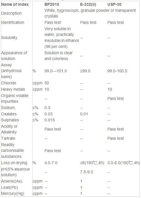use: used as buffer in the food industry, chelating agent, stabilizer, antioxidant, emulsifying agent and flavoring agent. Can be used for milk and dairy products, jelly, jam, meat, canned gel snacks, is also used for cheese , citrus preservation, etc.Used for hypokalemia…in pharmaceutical industry, potassium deficiency and alkalization of urine.